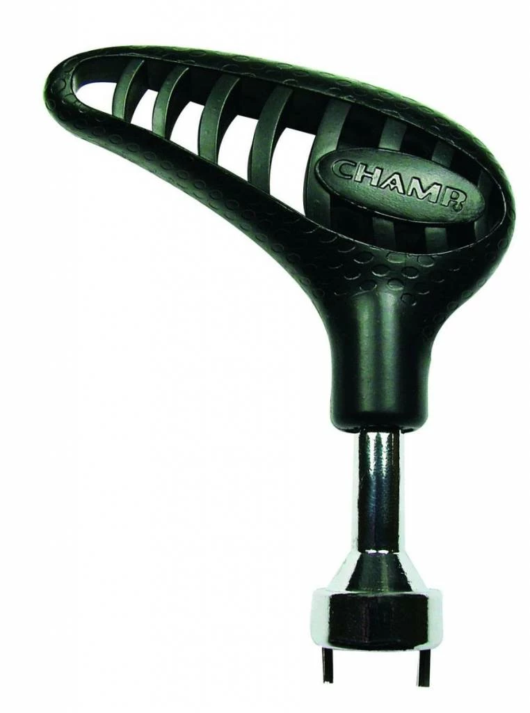 The number one shoe spike manufacturer on tour presents a premium spike wrench that makes spike attachment and removal a breeze. The Champ Pro Wrench is a solid, sturdy tool that features a contoured, ergonomic handle to ensure an efficient and comfortable operation. The tool comes with three attachments that work with the most popular spike threads, including standard, tri-lok and Q-Lok. The three position ratchet allows you to adjust the device for attachment or removal so that it only turns the spike in the desired direction.