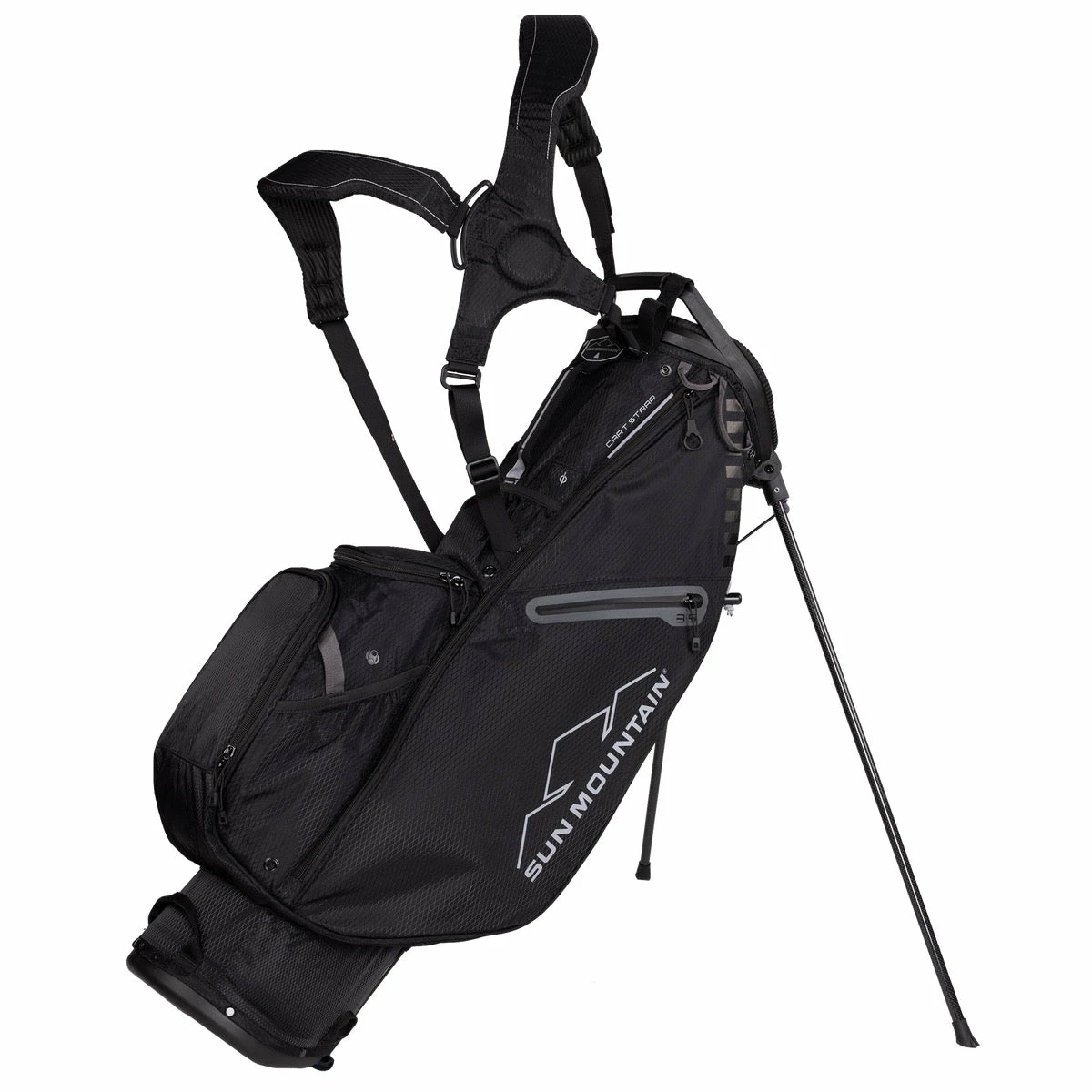 The 3.5LS is designed for the golfer who loves the popular 2.5+ but wants a few more features. Like the 2.5+, the 3.5LS is constructed with lightweight nylon fabric, high-strength-to-weight plastic, and carbon fiber legs. Adding a pound allows Sun Mountain to provide several more pockets, including a new range finder pocket.